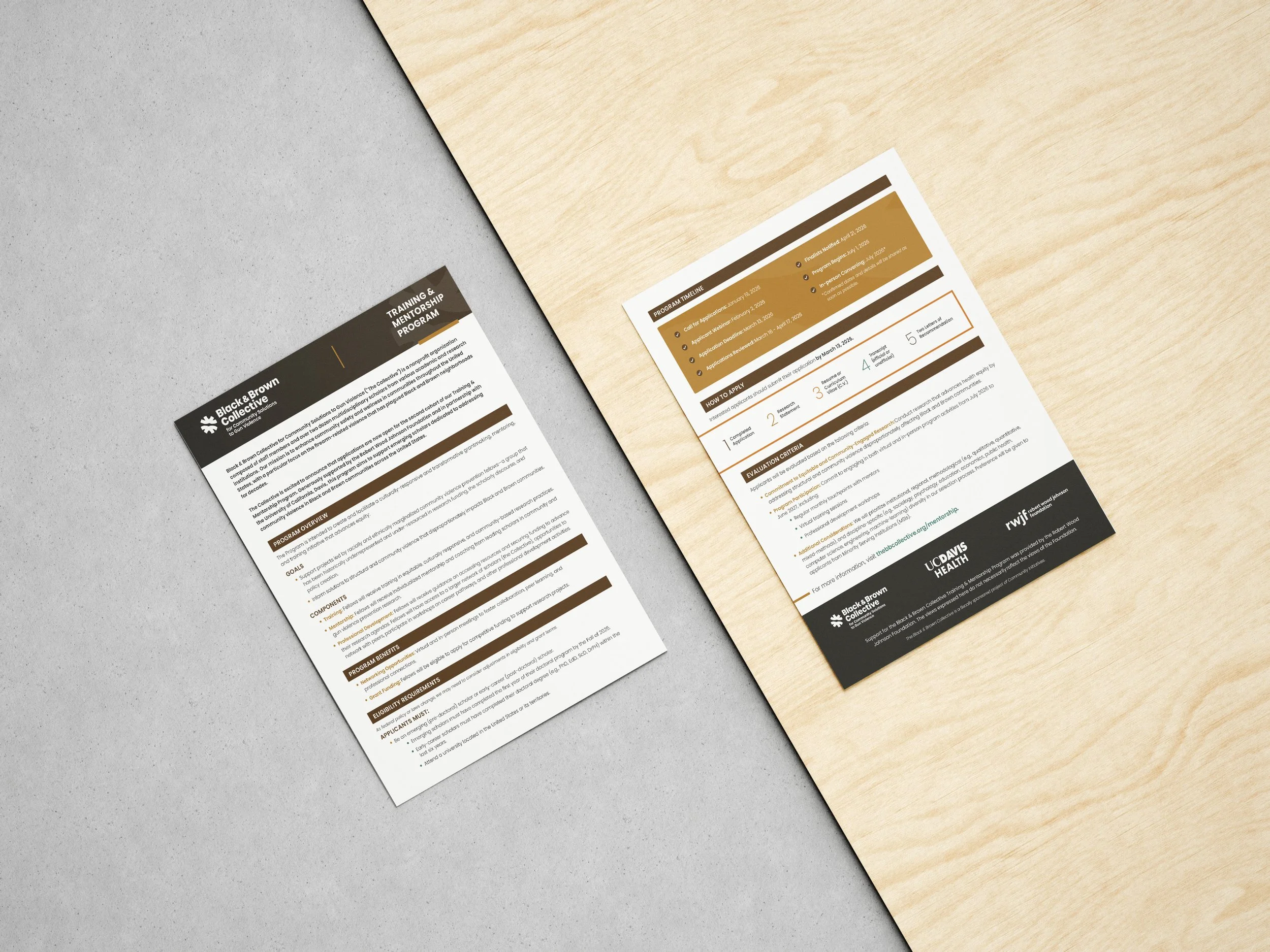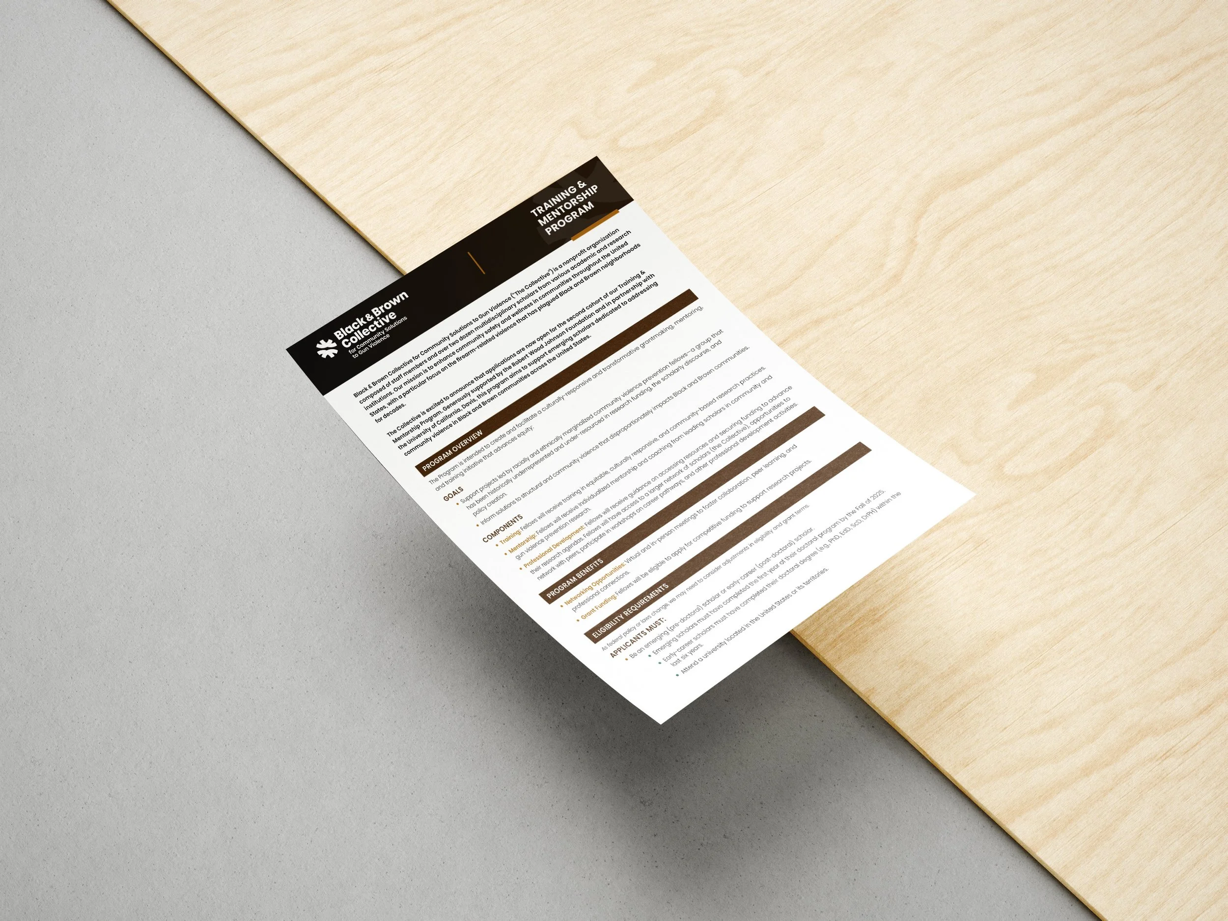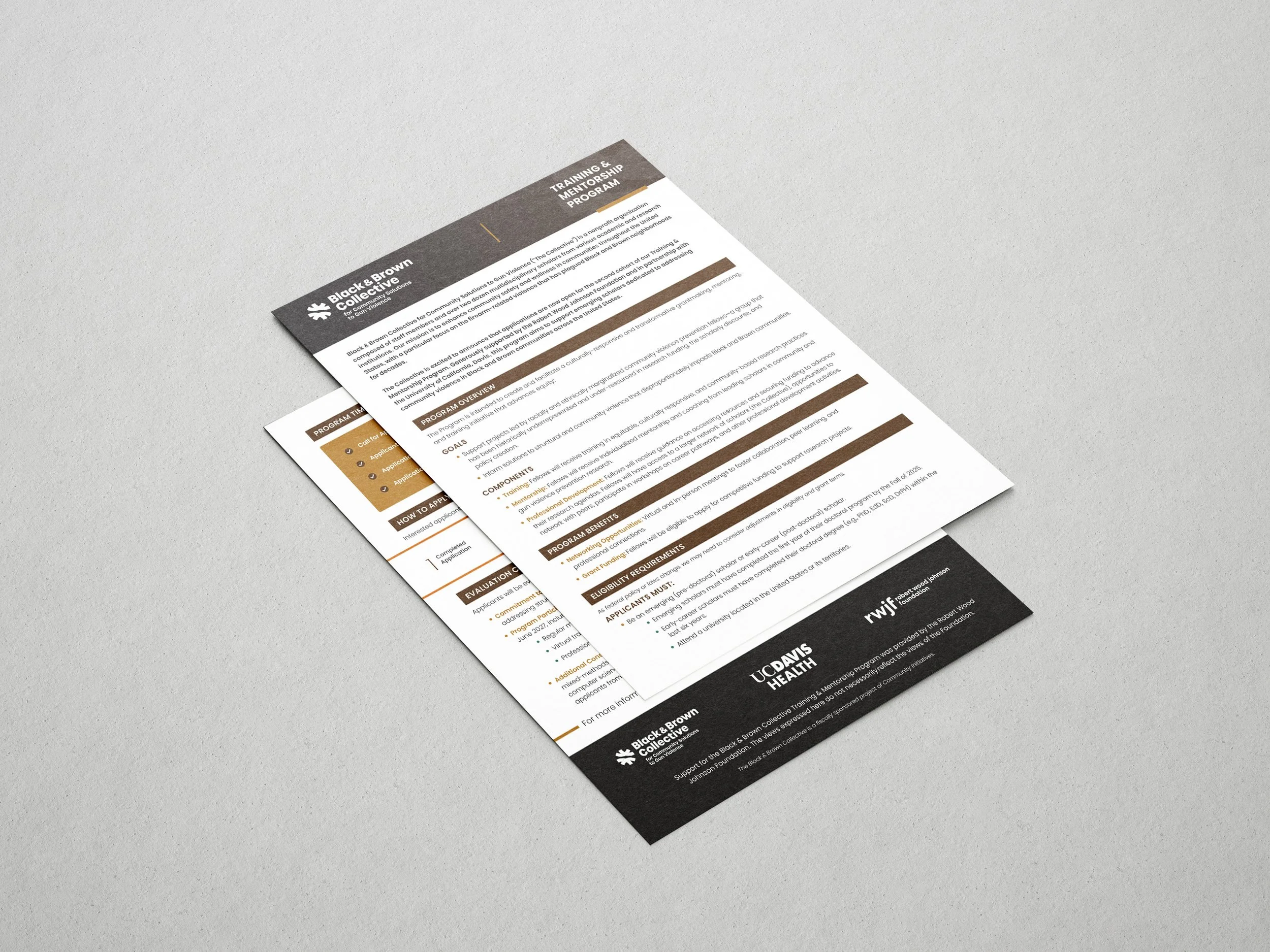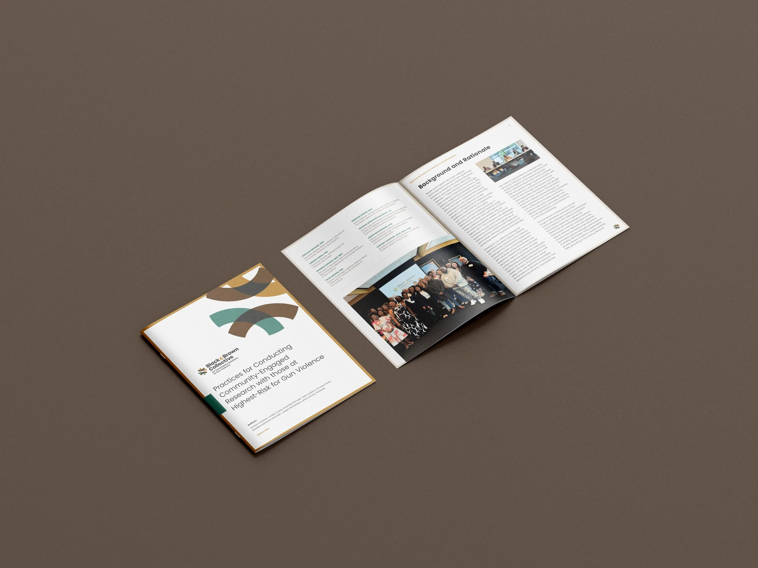Created branded print materials for Black & Brown Collective, including a booklet on best practices for community-engaged research with those at highest risk for gun violence, and a one-pager outlining a training mentorship program.